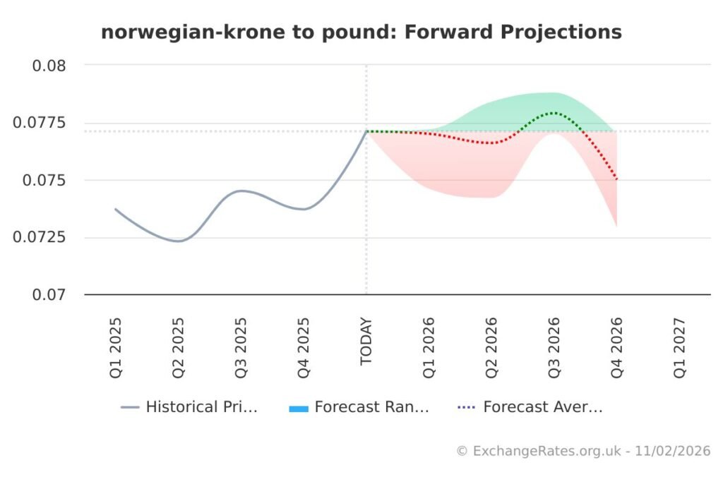 Norwegian Krone to Pound exchange rate outlook summary: NOK/GBP looks softer — 0.077000 early 2026, then 0.077900 late 2026, by 0.075000 early 2027.