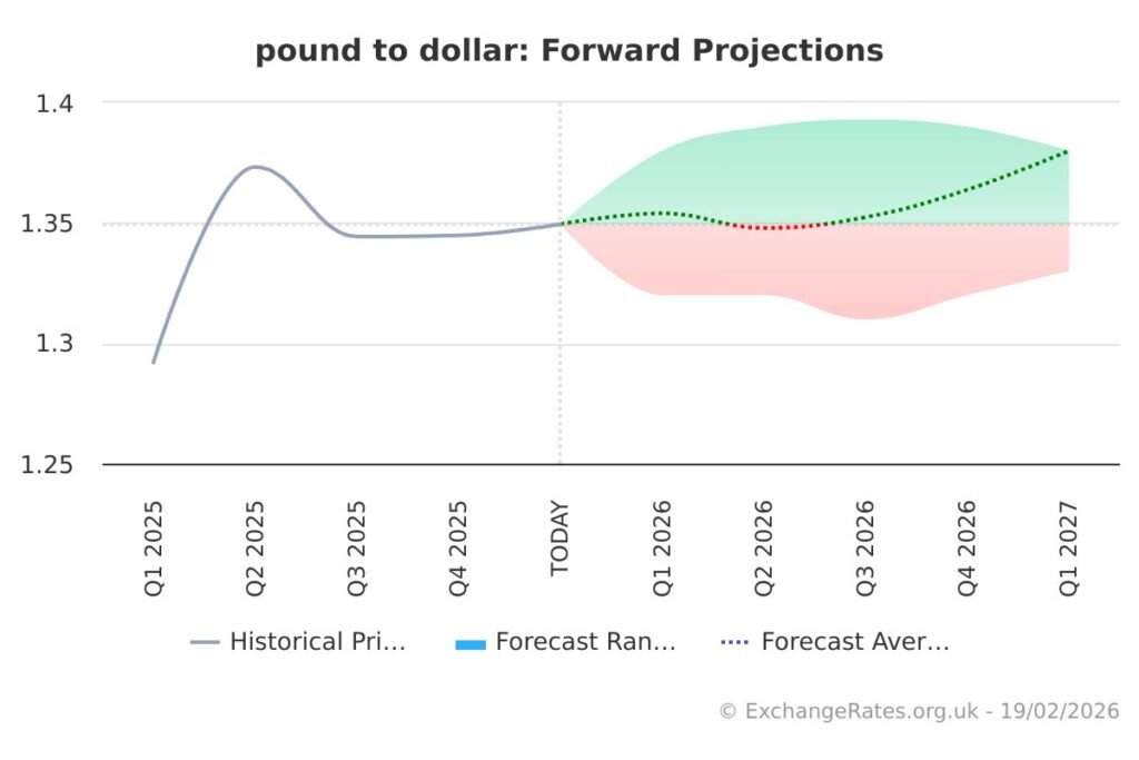 Pound to Dollar exchange rate outlook summary: GBP/USD looks firmer — 1.3540 early 2026, then 1.3524 late 2026, by 1.3800 early 2027.